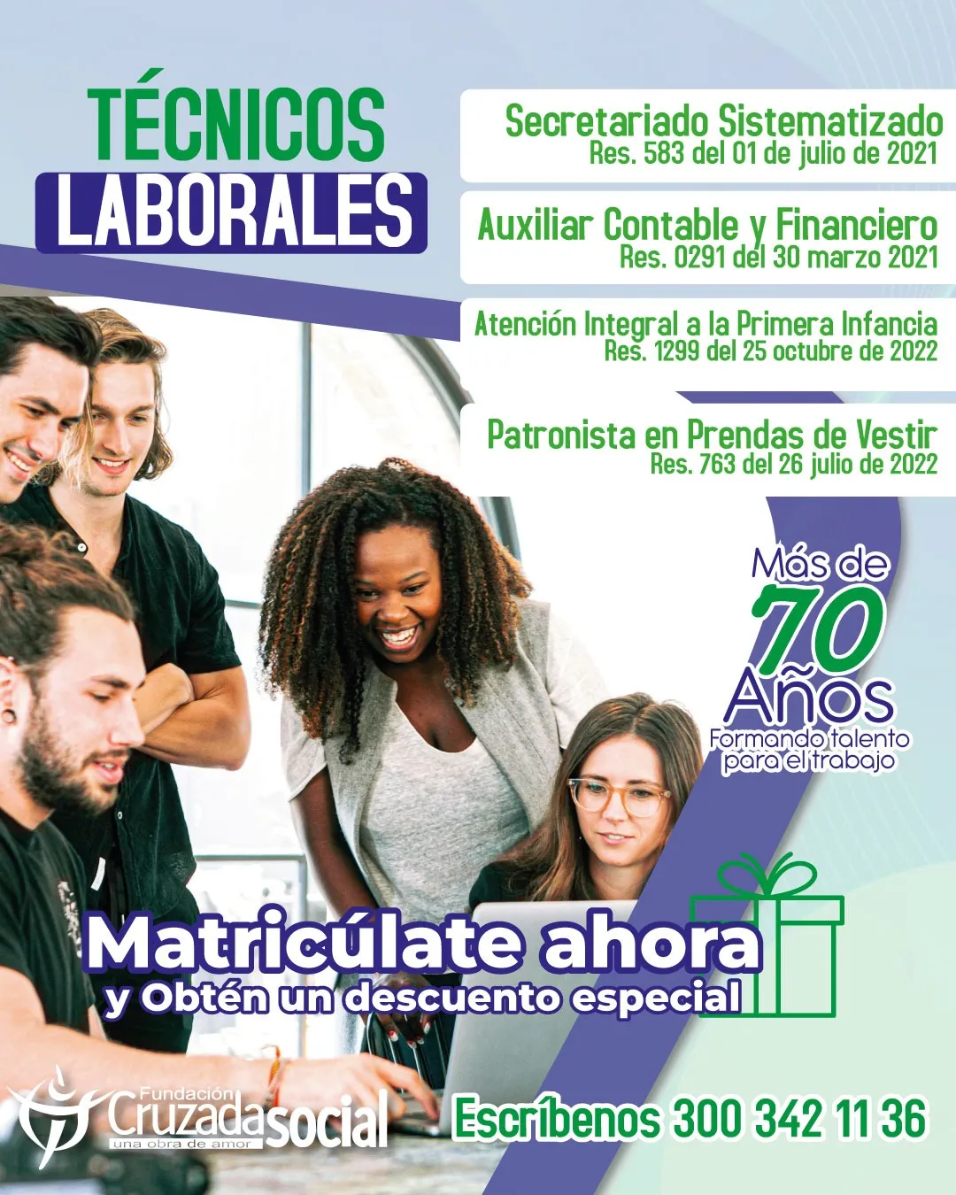 Brindamos formación técnica laboral y cursos cortos, para el desarrollo de competencias enfocadas a la vinculación laboral.